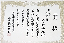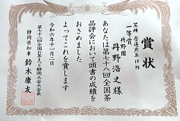 | 平成22(2010)年 | ・第64回全国茶品評会 一等 農林水産省生産局長賞 ・国際銘茶品評会 大賞受賞(日本茶部門で唯一の大賞受賞) ・川根本町茶品評会 優勝 |